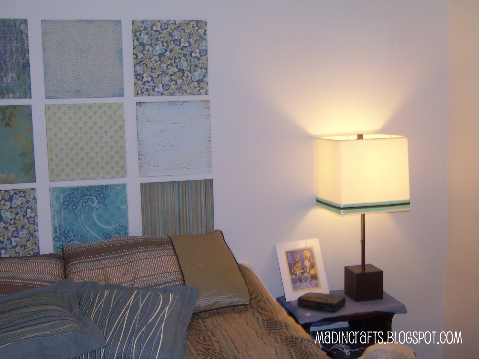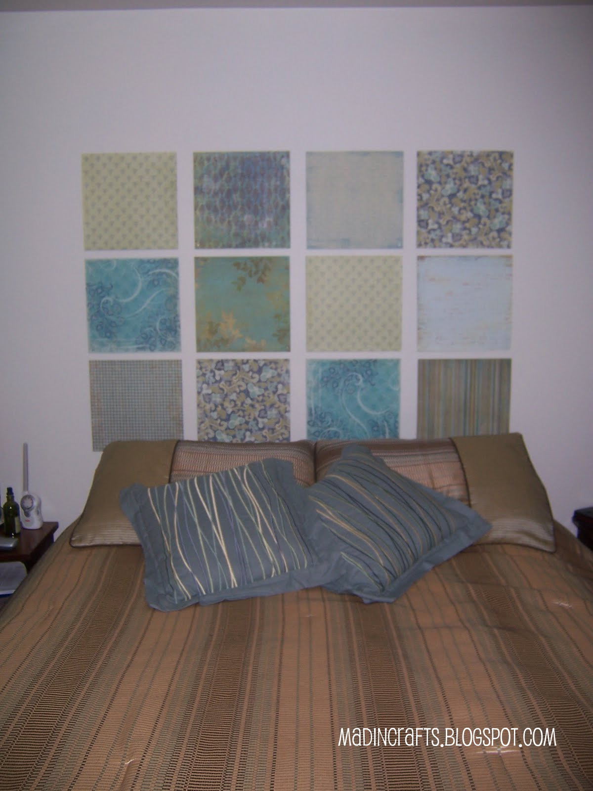 I had bookmarked this idea off of Dollar Store Crafts which originally put the idea into my head to make a headboard for our bed using scrapbook paper. I am a big lover of squares and straight lines, so I loved the look of that paper installation!