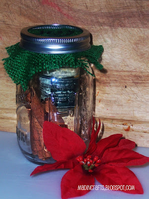 You can also turn this idea into an easy Christmas present. Put a few cinnamon sticks and some spices into a jar. Throw a little holiday material over the jar lid.