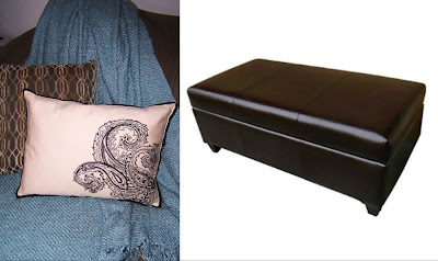 To give you some background info, here are a few things I have in my living room right now. Colors are basically chocolate brown, grayish-sage green, and beachy blue.