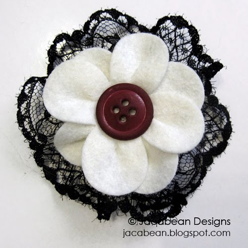 For the last flower: This one is really the same as the first cream one, but I added some lace to the back to make it a little bigger, and I do love my lace 🙂 Oh, and I created all my flowers with pin backs. To me, pins are most versatile, since you can stick them anywhere. You can even pin them to a stretchy headband, or to a clip to wear in your hair.