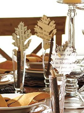 The major motifs I “borrowed” from PB are fall leaves, glass containers, and fall fruits and veggies – all pretty standard for autumn decorating. The one little idea I stole from them, and then ran with, is the addition of some book page leaves like those seen here.