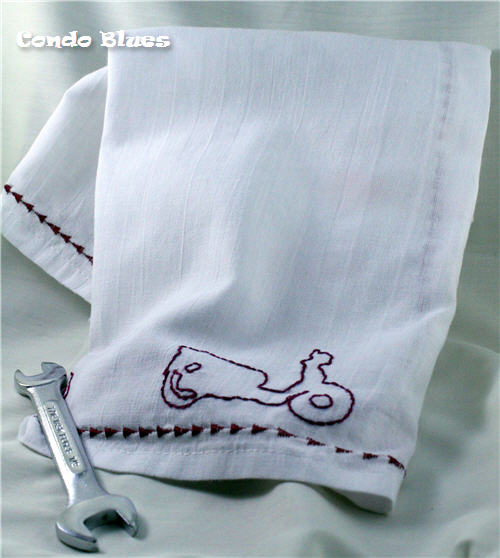 6. After embroidering the three scooters, my towels still needed something. I decided to jazz up the edge of my towels with some new fangled (my sewing machine is from 1972) sewing machine technology – cam stitching!