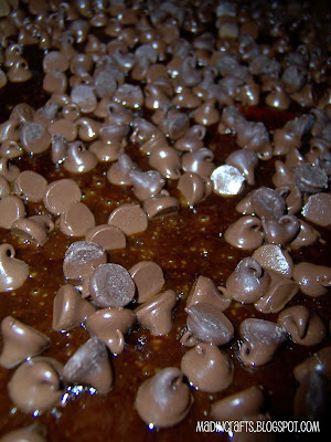 Remove the pan from the oven and sprinkle with an entire bag of chocolate chips. Let ’em get all melty-like.